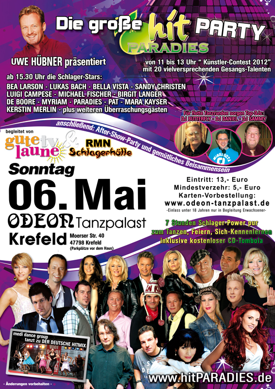 Präsentiert von Uwe Hübner im Tanzpalast Odeon Krefeld. Mit vielen Schlager-Stars, Künstler-Contest, DJ’s, und und und....