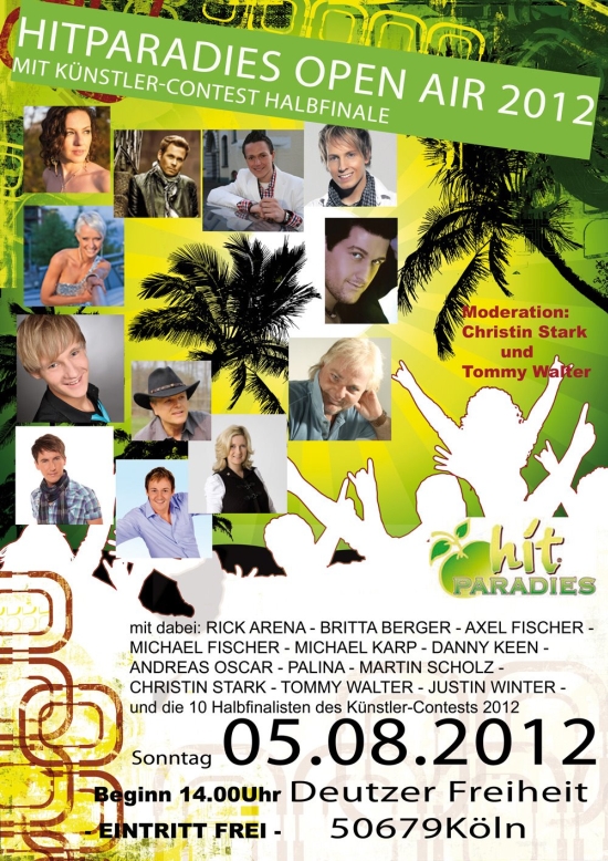 Bei dem HITPARADIES OPEN AIR 2012 findet neben dem reichhaltigen Künstler-Programm auch das Halbfinale des Künstler-Contest’s statt. Dabei habe ich die ehrenvolle Aufgabe, neben anderen Jurymitgleidern mit in der Jury zu sitzen und die Finalisten mit zu bestimmen. Vielleicht sieht man sich ja.... ;-)