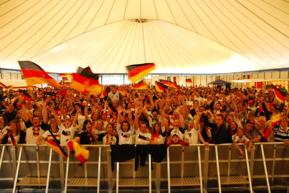 Wer das Außenzelt des Grefrather EisSport & EventParks nur unter Eis kennt, der wird am Sonntag große Augen machen. Die überdachte Eisfläche hat sich in eine einzigartige Public Viewing-Arena verwandelt. An der Kopfseite des Zeltes steht eine Traversen-Konstruktion mit einer 7 x 4 Meter großen Leinwand auf der alle Spiele der deutschen Nationalmannschaft übertragen werden. Zusammen mit einem Hochleistungsdatenprojektor und dem VRX 900 Tonsystem JBL hat die Firma Light and Sound 2000 die technischen Voraussetzung für das Rudelgucken-Deluxe geschaffen. Die Moderation zu allen Deutschland-Spielen im Grefrather EisSport & EventPark übernimmt in bewährter Form Rolf Frangen.
